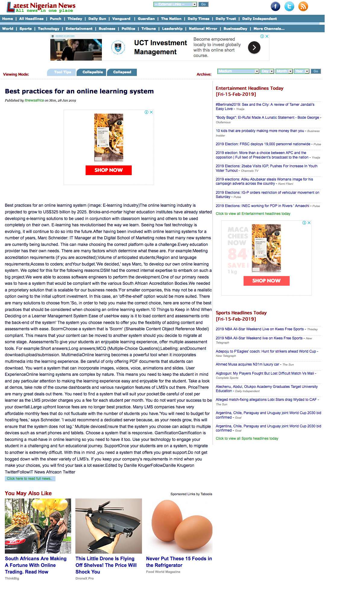 Best practices for an online learning system (image: E-learning Industry)The online learning industry is projected to grow to US$325 billion by 2025. Bricks-and-mortar higher education institutes have already started developing e-learning solutions to be used in conjunction with classroom learning and others to be used completely on their own. E-learning has revolutionised the way we learn. Seeing how fast technology is evolving, it will continue to do so into the future.After having been involved with online learning systems for a number of years, Marc Schneider: IT Manager at the Digital School of Marketing notes that many new systems are currently being launched. This can make choosing the correct platform quite a challenge.Every education provider has their own needs. There are many factors which determine what these are. For example:Meeting accreditation requirements (if you are accredited);Volume of anticipated students;Region and language requirements;Access to coders; andYour budget.’We decided,’ says Marc, ‘to develop our own online learning system. We opted for this for the following reasons:DSM had the correct internal expertise to embark on such a big project.We were able to access software engineers to perform the development.One of our primary needs was to have a system that would be compliant with the various South African Accreditation Bodies.We needed a proprietary solution that is scalable for our business needs.’For smaller companies, this may not be a realistic option owing to the initial upfront investment. In this case, an ‘off-the-shelf’ option would be more suited. There are many solutions to choose from. ‘So, in order to help you make the correct choice, here are some of the best practices that should be considered when choosing an online learning system.10 Things to Keep in Mind When Deciding on a Learner Management System Ease of useHow easy is it to load content and assessments onto the back-end of the system’ The system you choose needs to offer you the flexibility of adding content and assessments with ease. ScormChoose a system that is ‘Scorm’ (Shareable Content Object Reference Model) compliant. This means that your content can be moved to another system should you decide to migrate at some stage. AssessmentsTo give your students an enjoyable learning experience, offer multiple assessment tools. For example:Short answers;Long answers;MCQ (Multiple-Choice Questions);Labelling; andDocument download/upload/submission. MultimediaOnline learning becomes a powerful tool when it incorporates multimedia into the learning experience. Be careful of only offering PDF documents that students can download. You want a system that can incorporate images, videos, voice, animations and slides. User ExperienceOnline learning systems are complex by nature. This means you need to keep the student in mind and pay particular attention to making the learning experience easy and enjoyable for the student. Take a look at demos, take note of the course dashboards and various navigation features of LMS’s out there. PriceThere are many great deals out there. You need to find a system that will suit your pocket:Be careful of cost per learner as the LMS provider charges you a fee for each student per month. You do not want your success to be your downfall.Large upfront licence fees are no longer best practice. Many LMS companies have very affordable monthly fees that do not fluctuate with the number of students you have.’You will need to budget for hosting fees,’ says Schneider. ‘I would recommend a dedicated server because, as your needs grow, this will ensure that the system does not lag.’ Multiple devicesEnsure that the system you choose can adapt to multiple devices such as smart phones and tablets. Choose a system that is responsive. GamificationGamification is becoming a must-have in online learning so you need to have it too. Use your technology to engage your student in a challenging and fun educational journey. SupportOnce your students are on a system, to migrate to another is extremely difficult. With this in mind ,you need a system that offers you great support.Do not get bogged down with the sheer variety of LMS’s. If you keep your company’s requirements in mind when you make your choices, you will find your task a lot easier.